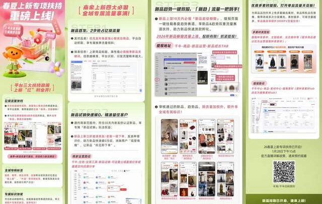 1 月 27 2026 关 淘宝服饰春夏上政策升级,亿级流量扶植原创优质新品! 作者 info@lekehill.com 淘宝推出“春上新”扶持政策,优化新品流量,提升原创优质产品曝光,推动行业向“更精、更优”发展。